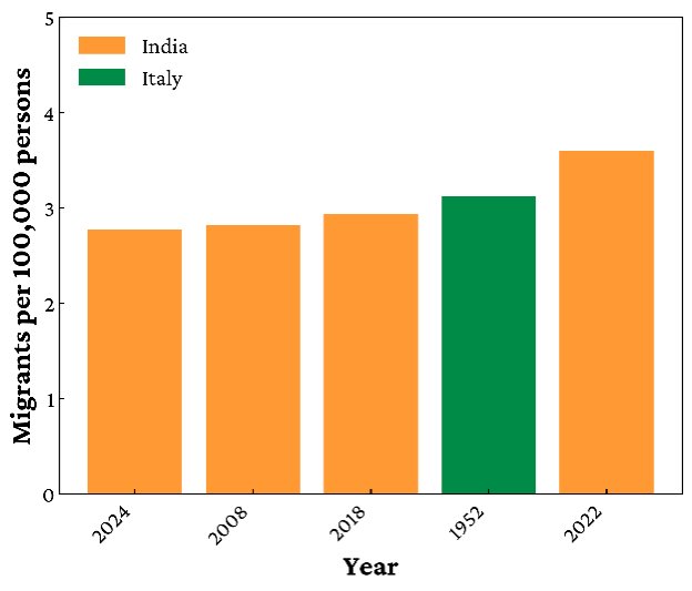Italian migration in 1952 is the only European year that comes close, and it still ranks below India’s recent surge.