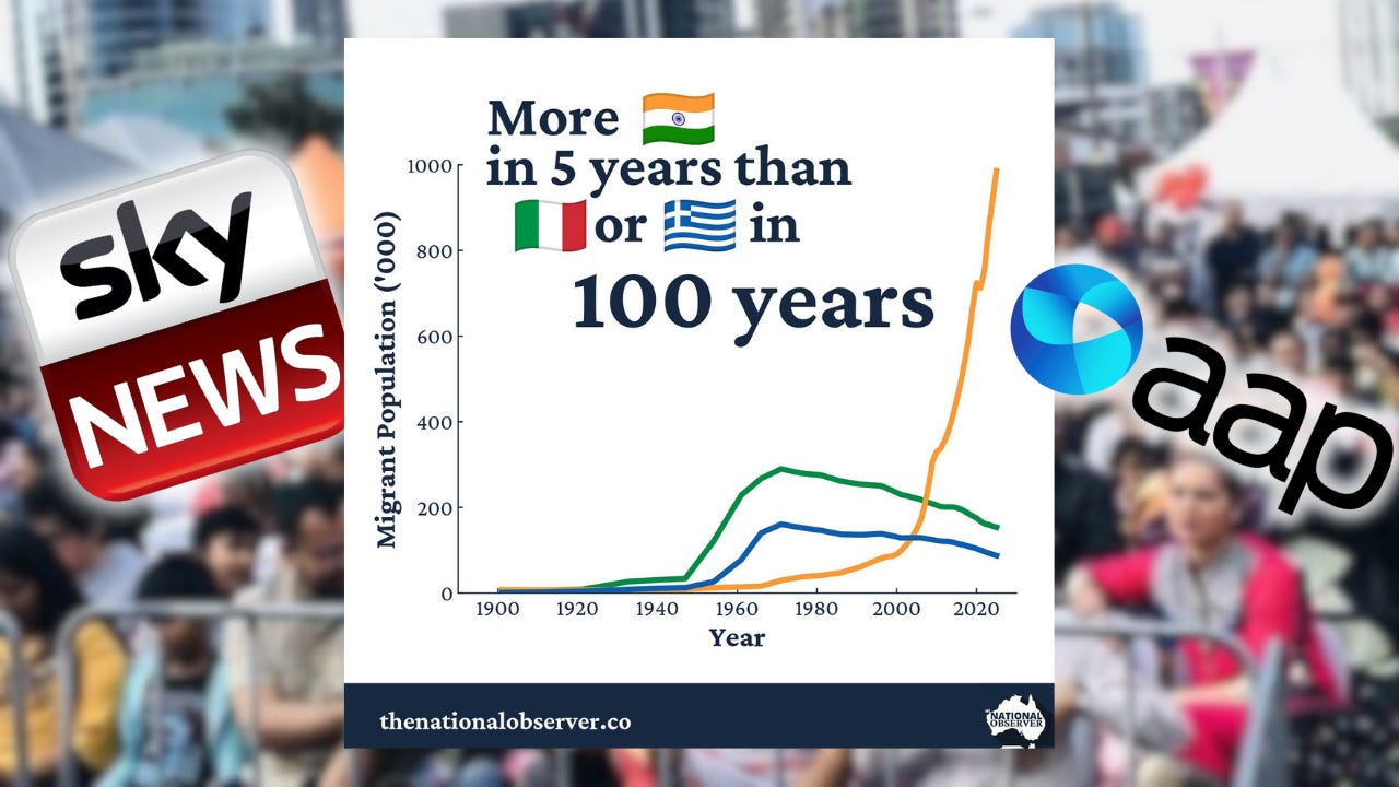 Over recent weeks, a simple but powerful claim has gained attention in Australia’s migration debate: that there are “more Indians in five years than Italians and Greeks in 100.” The statement was heavily circulated by the March for Australia organisers, and I published a graphic on X illustrating the rapid growth of the Indian-born population compared with the European migration waves that followed the Second World War.