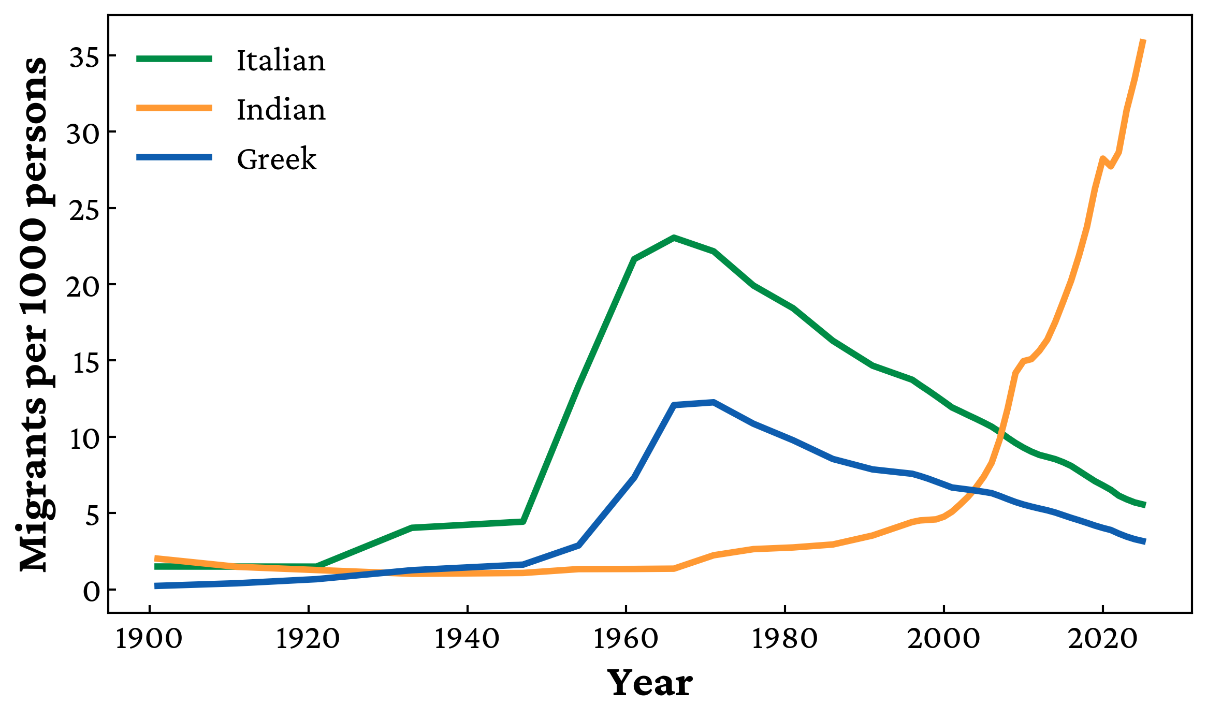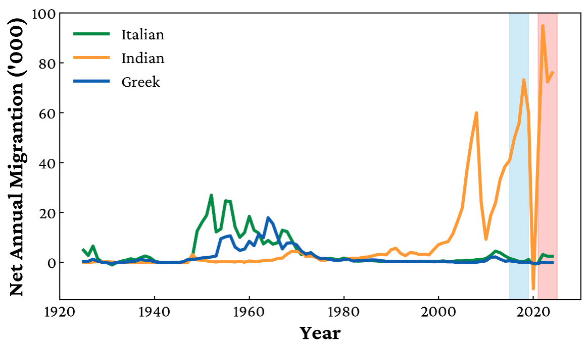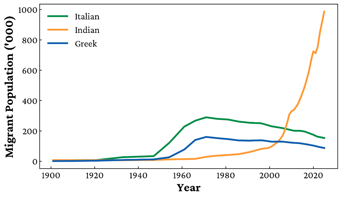 Taking this artificial decrease into account, the expected number of migrants in 2020 and 2021 would have been significantly higher. Combining those estimates with the actual data from 2022, 2023, and 2024, the five-year period to 2024 represents roughly 420,000 net Indian migrants. That total surpasses both the 208,598 Greeks and the 387,410 Italians who arrived in Australia between 1925 and 2025, and it is set to climb further once the ABS releases the 2024/25 figures.
