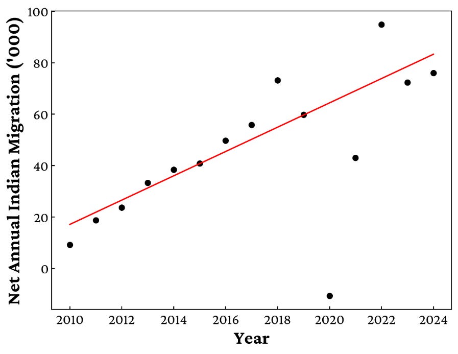 Four of the top five years for per capita migration since 1924 have involved Indians, all of them after 2008.