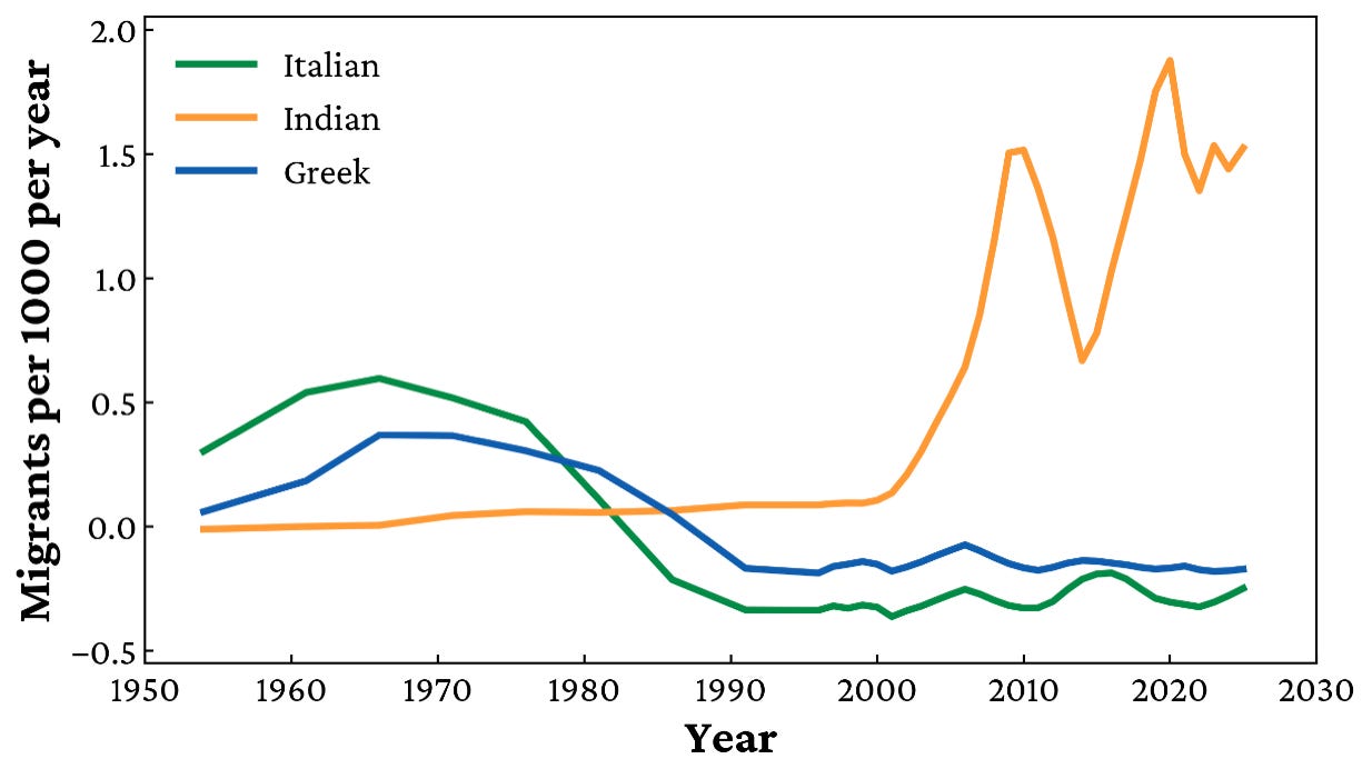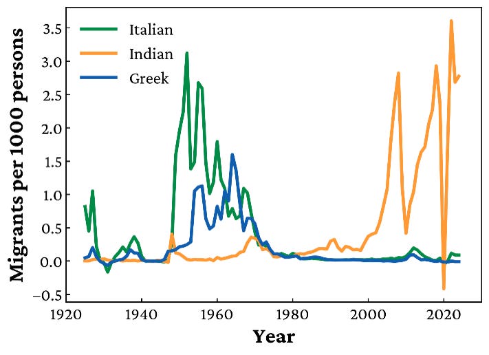 The final graph shows the trend clearly: when averaged across five-year spans, Italian and Greek migration rarely exceeded 0.5 arrivals per 1,000 Australians per year. Indian migration today runs at three times that level, 1.5 to 2 per 1,000 annually. The churn is higher, the numbers are bigger, and the rate of growth is far faster. Saying “we’ve seen it all before” is not only wrong, but it also erases the unique scale and nature of what is unfolding now.