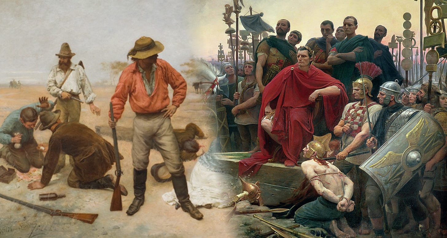 Our earliest colonies were fundamentally founded on coercive force. Convicts, exiles, and the working poor were pressed into a system that often favoured compliance over dignity, and survival over justice. Land was claimed, labour extracted ruthlessly, and law enforced by men who rarely belonged in spirit to the new land they ruled, but rather the lands from which they came. The bush - vast, indifferent, and unknowable to newcomers - was the place where imperial order thinned, and a man could live and die by his own merit alone.